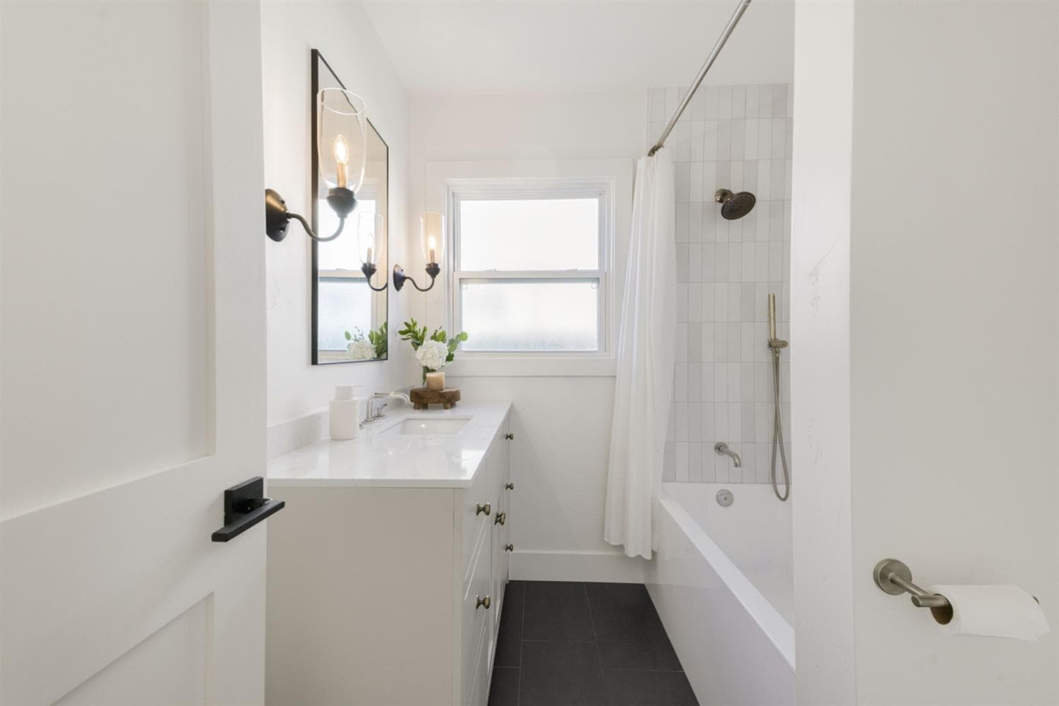 For the surround, the designer specified Cloé 2.5″ × 8″ Glossy Ceramic Tile in Grey by Bedrosians Tile & Stone — a clean, slightly retro profile that suits the bones of a 1950s home while reading as fresh rather than dated. On the floor, Metro 2.0 12″ × 24″ in Arcadia, also from Bedrosians, was set in a 50% stagger pattern for subtle visual movement and long-term durability underfoot.